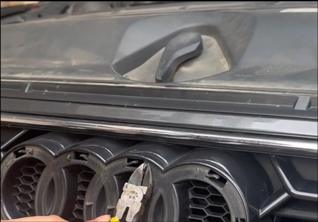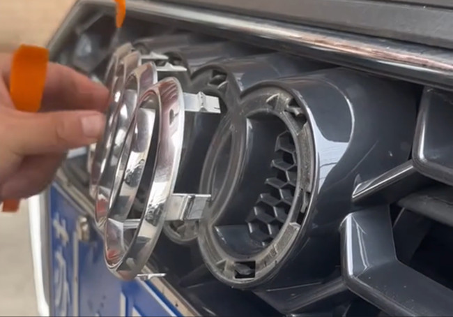 Die Audi Ringe sind mit 8 Clips befestigt. Schneiden Sie diese vorsichtig mit einem Cutter durch und entfernen Sie die originalen Ringe.