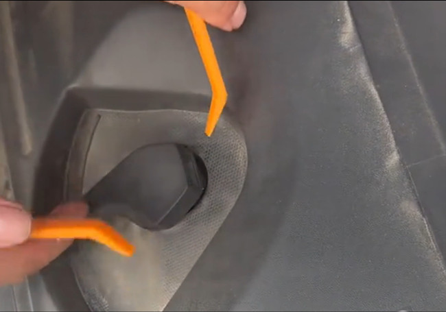 Verwenden Sie ein Kunststoff-Zierleistenwerkzeug, um den Knopf zu drücken und den Clip zu lösen, der an der Kunststoffabdeckung befestigt ist.