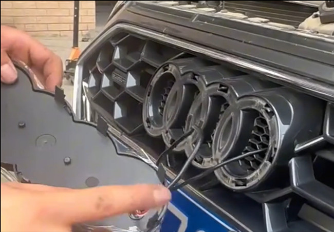 Führen Sie das Kabel der beleuchteten Audi Ringe durch den Kühlergrill und verlegen Sie es ordentlich hinter der Abdeckung, um Verheddern oder Beschädigungen zu vermeiden.