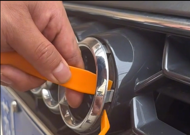 Lösen Sie die originalen Audi Ringe vorsichtig mit einem Zierleistenwerkzeug oder einem Schlitzschraubendreher vom Kühlergrill. Arbeiten Sie behutsam, um Kratzer zu vermeiden.